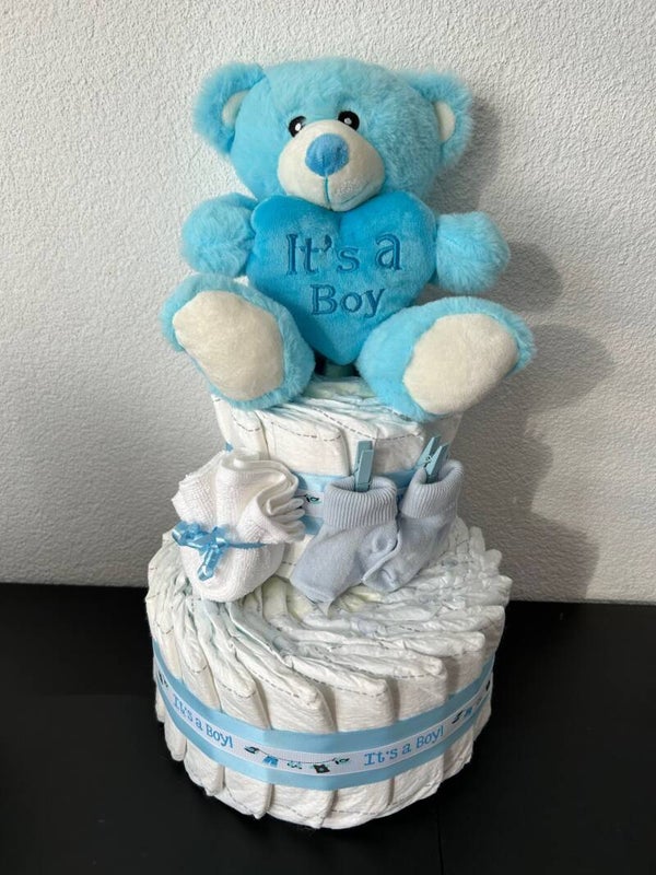 2-Laags Luiertaart gemaakt met pamper Luiers maat 3, een Knuffel It's a boy,monddoekje en sokjes